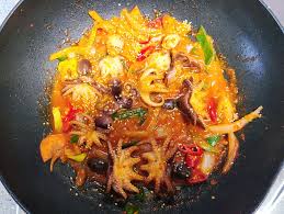 데친 쭈꾸미를 넣고 함께 볶아줍니다. 너무 오래 볶으면 질겨질 수 있으므로 빠르게 조리하는 것이 중요합니다. 짧은 시간에 센 불로 볶는 것이 식감을 살리는 핵심입니다. 골고루 섞어줍니다.